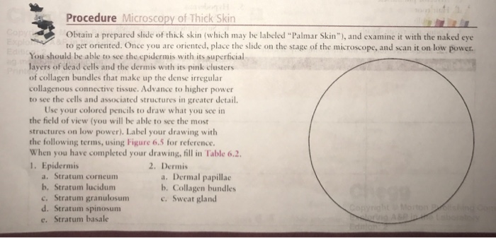 Thick skin labeled. photomicrograph of thick skin Diagram | Quizlet Start studying photomicrograph of thick skin. Learn vocabulary, terms, and more with flashcards, games, and other study tools. Solved Procedure Microscopy of Thick Skin obtain a prepared | Chegg.com Transcribed image text: Procedure Microscopy of Thick Skin obtain a prepared slide of thick skin (which may be labeled "Palmar Skin"), and examine it with the naked eye to get oriented. Once you are oriented, place the slide on the stage of the microscope, and scan it on low power. You should be able to see the epidermis with its superficial layers of dead cells and the dermis with its pink ... Thick skin: location, structure, histology | Kenhub In areas where the skin is thick, the epidermal layer varies from 400 to 1400 μm. The skin is the thickest on the soles of the feet and palms of the hands. The thick skin has five layers of the epidermis in comparison to the thin skin which has four. These five layers include (deep to superficial): Basal layer Spinous layer Granular layer Anatomy, Skin (Integument) - StatPearls - NCBI Bookshelf The skin is the body's largest and primary protective organ, covering its entire external surface and serving as a first-order physical barrier against the environment. Its functions include temperature regulation and protection against ultraviolet (UV) light, trauma, pathogens, microorganisms, and toxins. The skin also plays a role in immunologic surveillance, sensory perception, control of ...