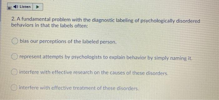 Psychiatrists and psychologists label behavior as disordered when it is. What Is Histrionic Personality Disorder, Amber Heard's Controversial ... According to a forensic psychologist hired by Johnny Depp's legal team, his ex — actress Amber Heard — has histrionic and borderline personality disorders. Heard's psychologist has said the only condition Heard suffers from is post-traumatic-stress disorder, due to Depp's alleged abuse.. The former couple is in the midst of a weeks-long defamation trial that's further exposed their toxic ... Psychiatrists and psychologists label behavior as disordered when it is ... Psychiatrists and psychologists label behavior as disordered when it is: a. aggressive, persistent, intentional, and has duration. b. selfish, habitual, harmful, and avoidable. c. deviant, dangerous, distressful, dysfunctional, and has duration. d. biologically influenced, unconsciously motivated, and difficult to change. Answers Psychological Labels: Read Carefully Before Applying When used correctly, labels are a great way to convey a lot of meaning in just a word or two. When misused, they can become weapons for dismissing, denigrating and dominating others. Here are some ways to become more conscious about the labels we use and why we use them. Solved 1. Psychiatrists and psychologists label behavior as - Chegg 1. Psychiatrists and psychologists label behavior as disordered when it is: aggressive, persistent, and intentional. O selfish, habitual, and avoidable. deviant, distressful, and dysfunctional. biologically influenced, unconsciously motivated, and difficult to change. Listen 2. A fundamental problem with the diagnostic labeling of psychologically