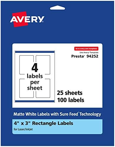 Avery | Labels, Cards, Dividers, Office Supplies & More 4.5" x 5.75" Blank Rectangle Labels, Print to the Edge Write a review 100% Satisfaction Guaranteed. 1. Material Compare Materials Matte White Paper 2. Printer Type Compare Printer Types Laser and Inkjet Printers Prints on both Laser and Inkjet Printers 3. Quantity & Price 100 Sheets 200 Labels $0.27/sheet $27.00 100 Sheets 200 Label s $0.27/sheet