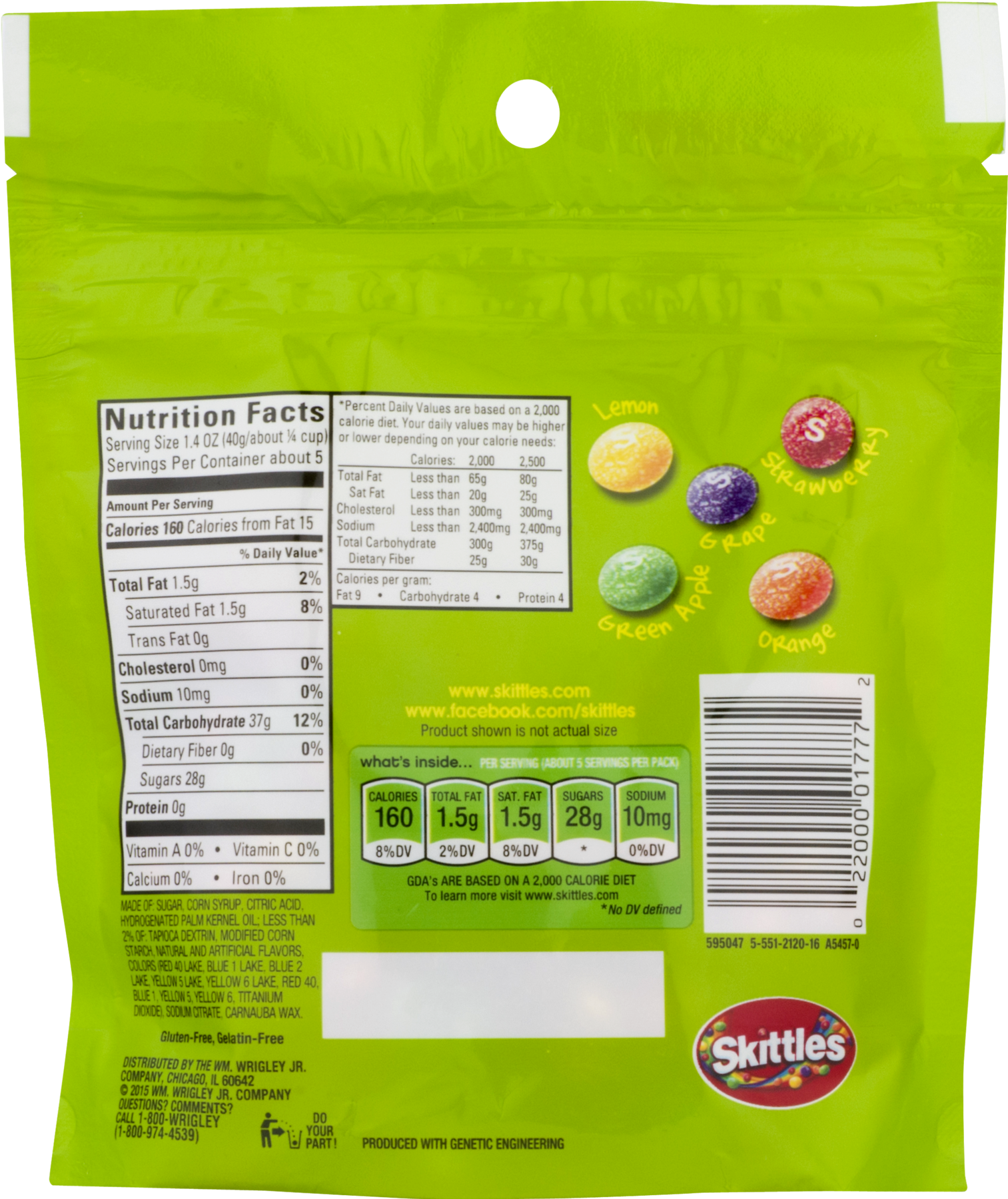 Skittles Original Allergy and Ingredient Information Skittles Original Bite size, chewy candiesGrape, lemon, green apple, orange, and strawberry flavorsGluten free, UPC Code 040000001607 Manufactured by Wm. Wrigley Jr. Company ... Nutrition Label. Nutrition Facts. Serving Size 1.00 package. Amount Per Serving. Calories 250 Calories from Fat 25 % Daily Value* Total Fat 2.5g. 3.84%. Saturated Fat 2 ...
