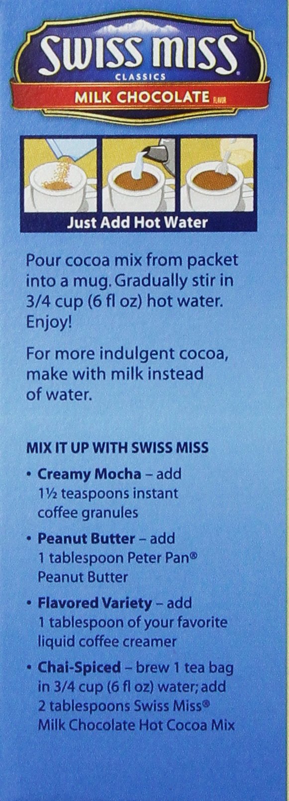 Swiss miss ingredients label. Swiss Miss Powdered Milk, 12.98 Oz - amazon.com Make sure your Survival food supply is complete with this versatile powdered milk; Perfect for any emergency food stash. Contains one 12.98-Ounce canister of Swiss Miss nonfat dry milk with vitamins A and D. New (8) from $9.81 FREE Shipping on orders over $25.00 shipped by Amazon. No Sugar Added Hot Cocoa Mix | Swiss Miss No Sugar Added Hot Cocoa Mix. The rich and creamy Swiss Miss hot cocoa mix you love with no sugar added. Available Sizes: 8 ct. See ingredients, nutrition, and other product information here. Buy Now. Nutrition Facts for Swiss Miss No Sugar Added Hot Cocoa Mix Swiss Miss No Sugar Added Hot Cocoa Mix Nutrition Facts Serving Size envelope 1 envelope = 21g Amount Per Serving 80 Calories % Daily Value* 2% Total Fat 1g 5% Saturated Fat 1g Trans Fat 0g 0% Cholesterol 0mg 8% Sodium 190mg 5% Total Carbohydrate 14g 4% Dietary Fiber 1g Total Sugars 11g 0% Includes 0g Added Sugars Protein 2g 0% Vitamin D 0mcg Swiss Miss Nutrition Facts. Calories, carbs, fat, sodium ... - MyFoodDiary Get nutrition information for Swiss Miss items and over 200,000 other foods (including over 3,500 brands). Track calories, carbs, fat, sodium, sugar & 14 other nutrients. Toggle navigation. ... Swiss Miss Milk Chocolate w/ Marshmallows Hot Cocoa. 0.1875 tbsp (27g) Nutrition Facts. 140 calories. Log food: Swiss Miss Old Fashioned Tapioca Pudding.