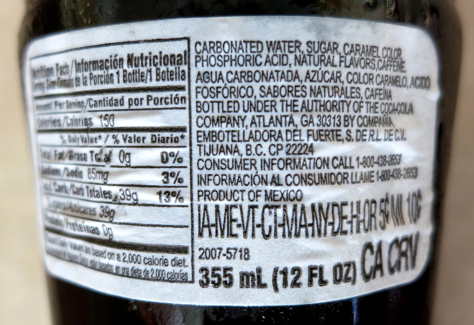 The Food Lab, Drinks Edition: Is Mexican Coke Better? But take a closer look at the nutrition information and you'll find that for the same 355 mL serving, American Coke has 140 calories and 45 mg of sodium, while the Mexican version has 150 calories and 85 mg of sodium. How do you explain this? I called up the Coca-Cola company to find out and talked a bit with a very pleasant lady named Annette.