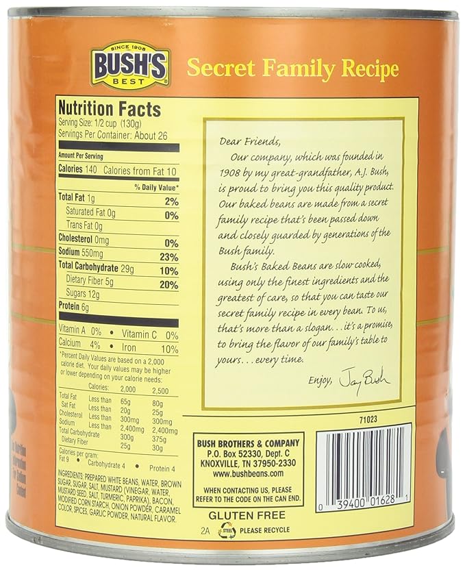 Bush baked beans nutrition label. Top 15 Best Canned Baked Beans in 2022 (Recommended) 26.02.2022 · When you’re craving some spicy flavor, you can serve your foods with Bush’s Best Homestyle Canned Baked Beans as a side dish. As for nutrition, each serving of this product contains 7g of protein, 4g of fiber, 50mg of calcium, and 370mg of potassium. Therefore, it seems to provide you a good amount of nourishment daily. Bush's Vegetarian Baked Beans - 28oz : Target Whether it’s hot dogs, hamburgers, turkey burgers or a meat-less favorite on your table, it only makes sense that Bush’s Baked Beans go on the side. Our Vegetarian Baked Beans recipe uses tender navy beans, slow-simmered in a tangy, meatless, sweet tomato sauce seasoned with brown sugar and a special blend of spices. So whether you’re fixing up a summer cookout, a … Soybean - Wikipedia The soybean, soy bean, or soya bean (Glycine max) is a species of legume native to East Asia, widely grown for its edible bean, which has numerous uses.. Traditional unfermented food uses of soybeans include soy milk, from which tofu and tofu skin are made. Fermented soy foods include soy sauce, fermented bean paste, nattō, and tempeh.Fat-free (defatted) soybean meal is a … Gluten-Free Baked Beans: 4 Brands You Can Trust - Verywell Fit 05.04.2022 · Bush's baked beans are available in most mainstream grocery stores nationwide, and offer an easy choice for people who eat gluten-free, since all varieties are gluten-free. You can choose from Original, Vegetarian, Organic, Barbecue, Brown Sugar, Brown Sugar Hickory, Country Style, Homestyle, Maple & Cured Bacon, Honey Sweet, Onion, Sweet & Tangy, Sweet Heat, and …