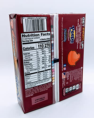 HOT TAMALES® Fierce Cinnamon Flavored Marshmallow Chicks - Peeps 27 calories per chick / 110 calories per serving / 2.5 servings per package. sugar, corn syrup, gelatin, contains less than 0.5% of the following: natural and artificial flavors, maltodextrin, gum arabic, yellow #5 (tartrazine), red #40, yellow #6, blue #1, potassium sorbate (a preservative), carnauba wax. fat free gluten free