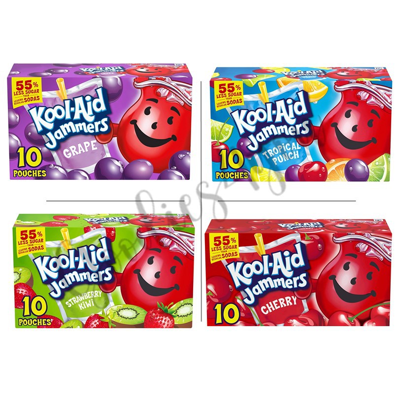 Kool-Aid Jammers Tropical Punch, Grape and Cherry Artificially Flavored ... One 40 ct. box of Kool-Aid Jammers Artificially Flavored Drink Variety Pack Every box contains 20 Tropical Punch, 10 Cherry and 10 Grape artificially flavored drink pouches Each drink pouch comes packed with flavor kids love Kool-Aid Jammers deliver fun fruit flavors in a convenient pouch Contains 55% less sugar than leading regular sodas (Per ...