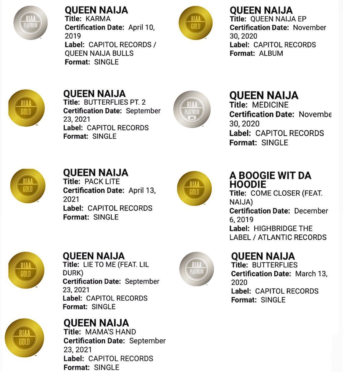 Queen Naija bio: Husband, children, nationality, net worth, albums - TUKO Queen Naija EP Queen Naija EP was her first major project under Capitol Records. The 2018 project also made it to some of the popular charts in the world. For example, in the US R&B chart, it peaked at number 2. As of 2021, the project is certified Gold in RIAA. Medicine - A single Medicine is Queen Naija's biggest song yet.