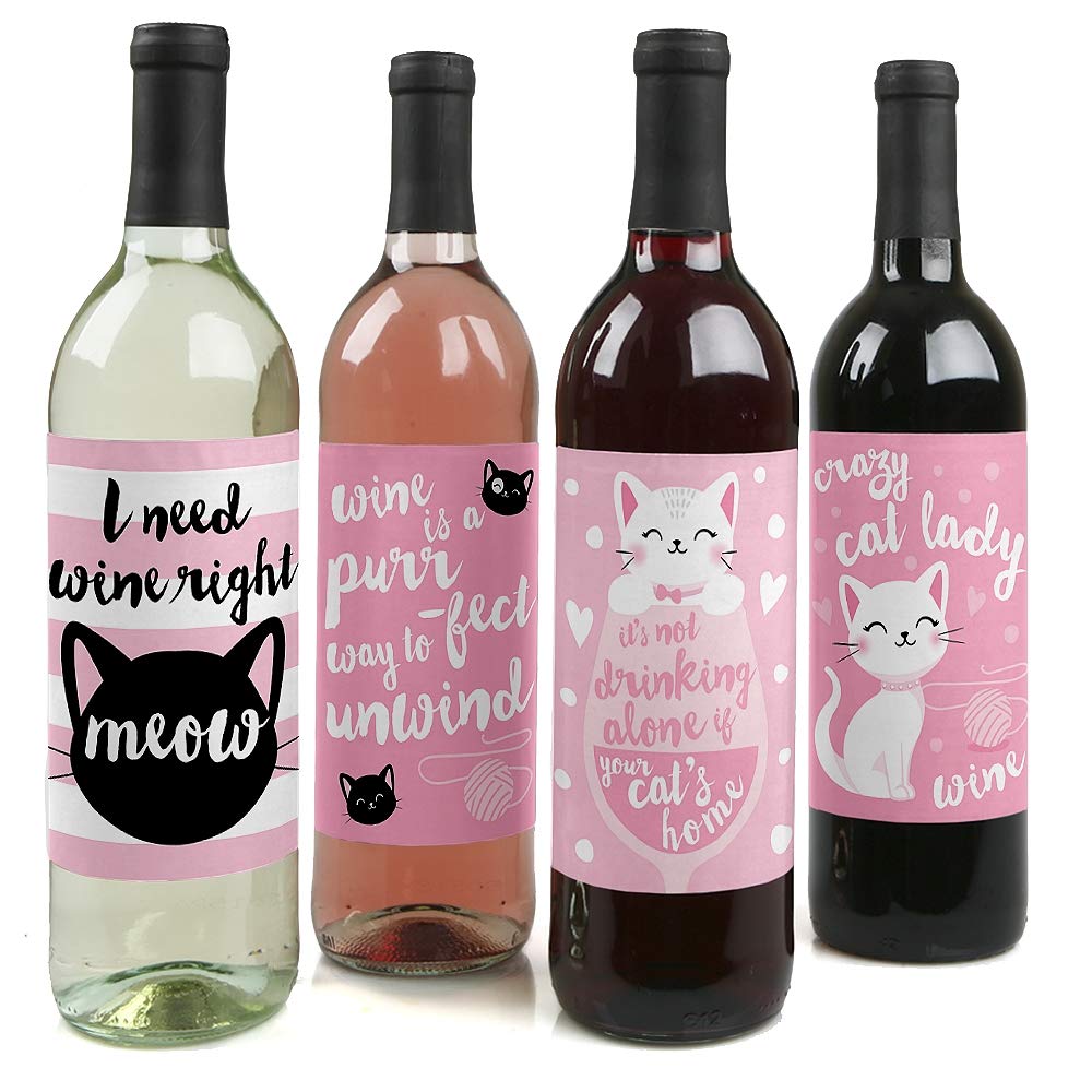 Big Dot of Happiness Purr-fect Kitty Cat - Kitten Meow Birthday Party Decorations for Women and Men - Wine Bottle Label Stickers - Set of 4