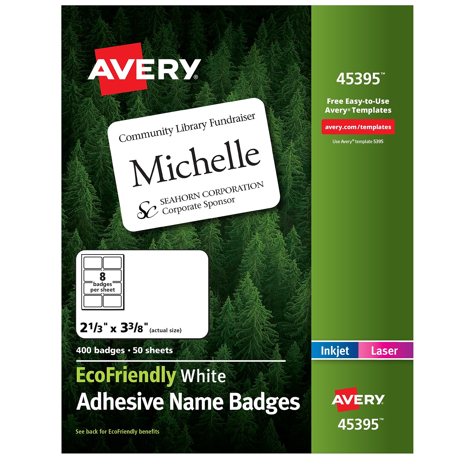 Avery Adhesive Laser/Inkjet Name Badges, - Staples.com 08395 Avery Name Badges Avery offers a wide variety of name badges to fit your specific needs. Whether you need badges that employees and visitors can wear every day, badges for a multi-day meeting or seminar, or one-day badges for parties or events, there's a badge for you.